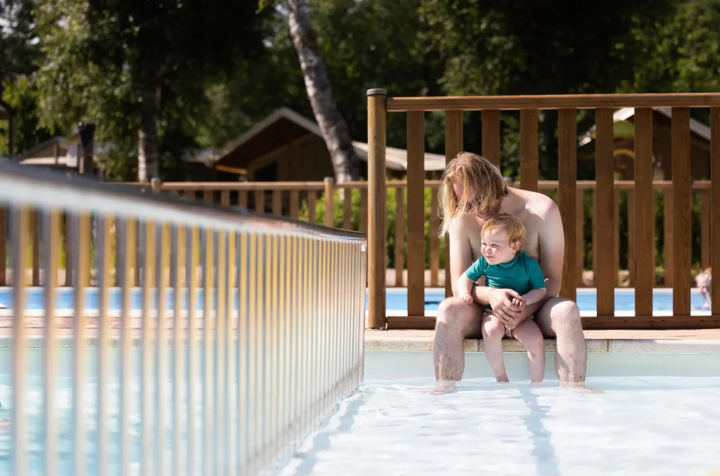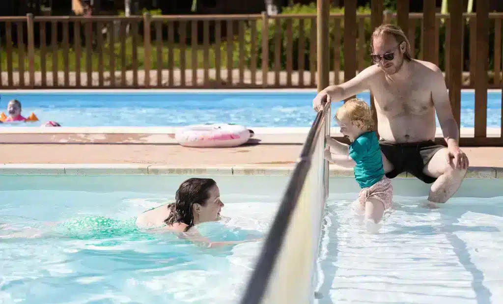 Pour les enfants, une pataugeoire intégrée dans le grand bassin facilite leur initiation à l’eau, tandis que les parents profitent des transats situés au bord.